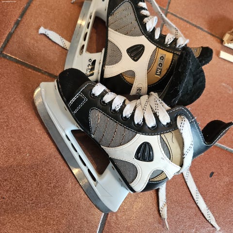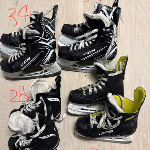 CCM Ishockey skøyter for barn i størrelse 32. Skøytene er utstyrt med hvite lisser og har et svart design med hvite detaljer.