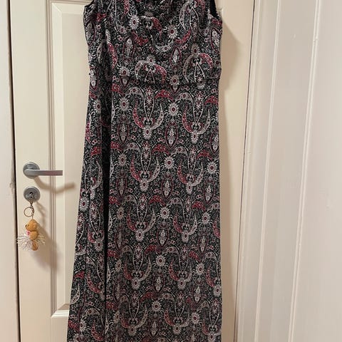 Primark Atmosphere hverdagskjole i størrelse. Kjolen er laget av polyester og har en rød farge med mønster, sitter veldig fint på, men det var den krympingen i skapet 🫣