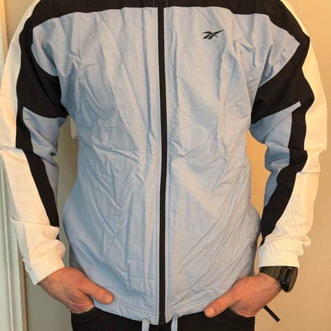Reebok Les Mills jakke i størrelse M for menn. Jakken er svart og egnet for ulike sportstyper. Materialet og designet gjør den passende for trening og fritidsbruk.