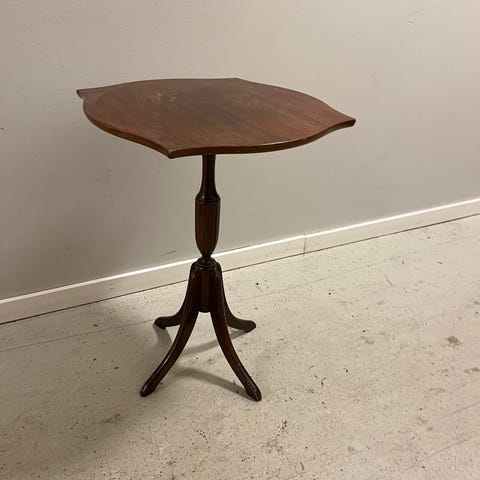 Bord i mørkt tre (eller mørkbeiset) med utskårne ben og en rektangulær bordplate. Bordet har en klassisk design og viser detaljer i treverket. Barokk stil. Bordplaten trenger en liten puss. Underdelen er i pen stand. Passer som stue- eller avlasningsbord.