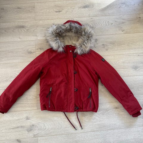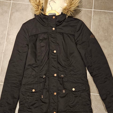 Pent brukt canvas jakke i farge grønn. Fôret hette med kunstig pels rundt kanten. Fra ONLY.