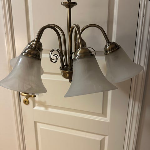 Taklampe med 3 lys og 3 lodd som man kan justere høyde/lenge på lysene. Selges for 2000,-