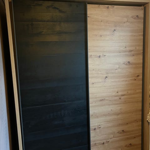 Selger et romslig SONGESAND garderobeskap i mørk brun utførelse. Skapet har et klassisk uttrykk med panelporter og en praktisk speildør som sparer plass.