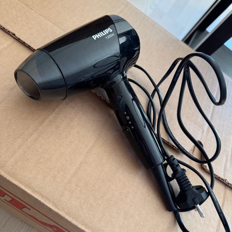 Selger denne praktiske hårføneren! Super til reiser, tar liten plass og funker bra. Philips 1200 W.