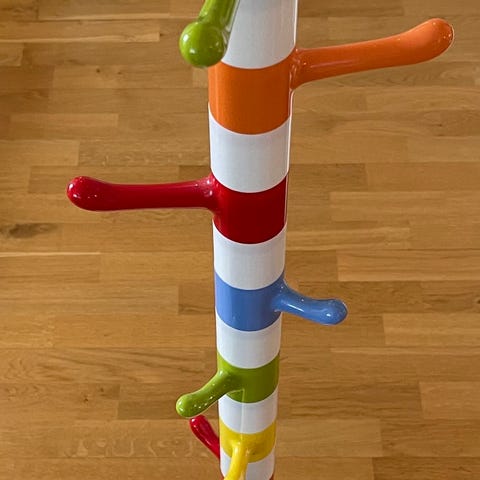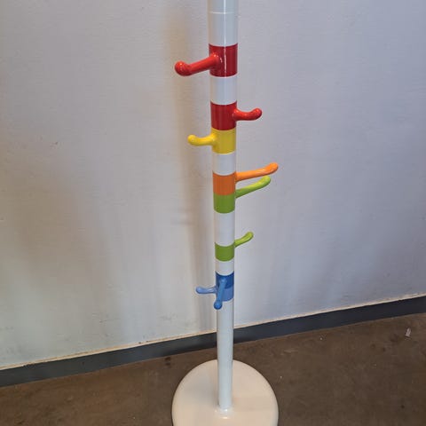 IKEA stumtjener i flere farger. Laget av malt metall med kroker i ulike farger som oransje, grønn, gul og rød. Passer til oppheng av klær og tilbehør i barnerom. Høyde 128cm