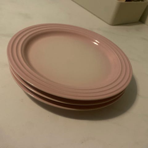 Le Creuset servise sett bestående av tallerkener og krus i flere farger. Tallerkenene kommer i ulike størrelser og farger som blå, rød, gul og hvit. Krusene er i fargene beige, svart, oransje og hvit. Materialet er keramikk, egnet for daglig bruk i kjøkken og til servering. 10 stk middags tallerkener,6stk dype,6 frokost,6kaffe kopper,2 krus. Selges samlet til et veldig lav pris