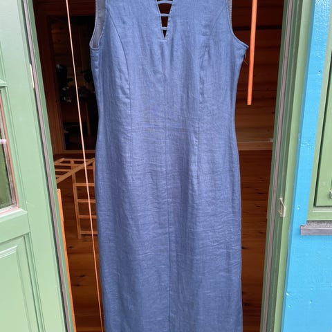Sommerkjole fra Steilmann i rød lin med for i polyester. Uten ermer, nedringet og med morsom knyttedetalj øverst på livstykket bak.