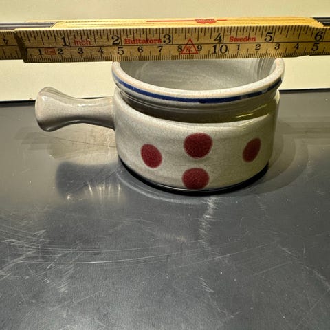 Har en lignende keramikkpotte, en del mindre i størrelse, mulig en smørsmelter, som omtales i en annen annonse.
