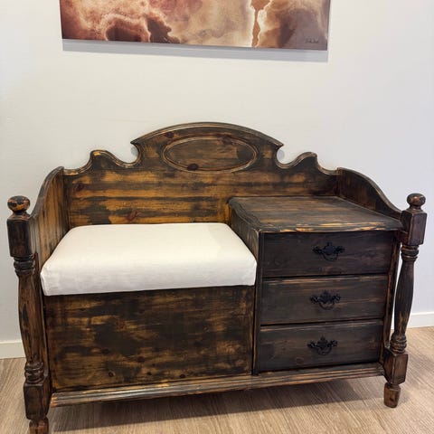 Vintage trebenk med integrert oppbevaringsrom. Benken har en mørk rødbrun finish og flere rom for oppbevaring. Passer til bruk som sittebenk eller oppbevaringsmøbel. Leveres eller hentes i Oslo.