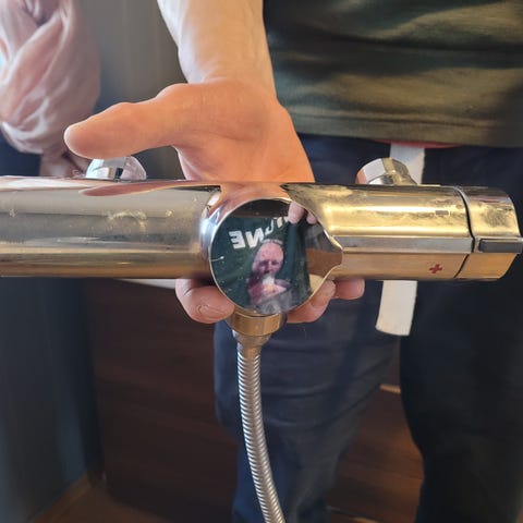 Dusjbatteri med termostat og hånddusj for hjørnemontering