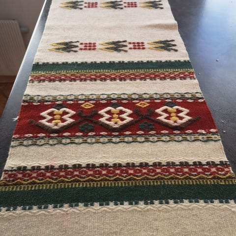 En utrolig vakker håndbrodert løper med lys i lysestaker på hver side.