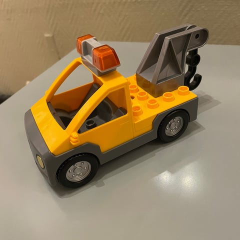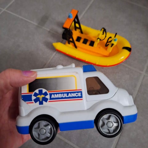 Leketøy sett som inkluderer en gul dumper, en liten båt med rød og gul farge, samt en grønn bil med lilla fører. Laget av plastmateriale, egnet for barn.