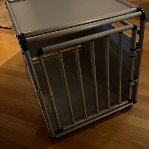 Hundebur i svart metall med mål 60 cm i lengde, 45 cm i bredde og 45 cm i høyde. Avtagbar bunnplate for enkel rengjøring. Buret mangler en dør låsemekanisme. Må hentes.