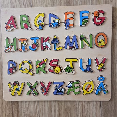 Laget av tre, har hele norske alfabetet og er fine å se og leke med.