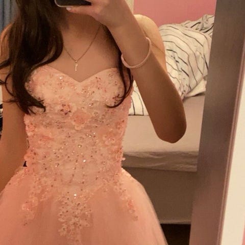 Nydelig lys ferskenfarget ballkjole fra Alexandra Ritzi! Størrelse XS’ og tilpasset høyde ca 165 cm. Nydelige detaljer med blomster i overdel og glitter i skjørtet! Som ny og uten merker- brukt kun en kveld -