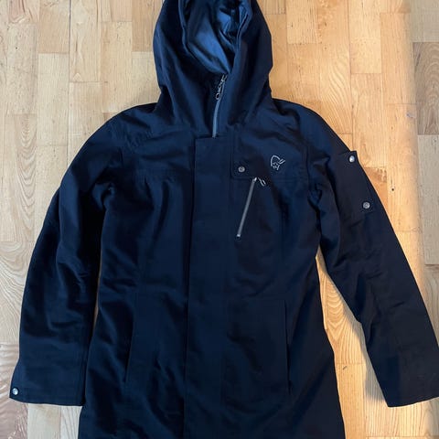 Superfin vanntett og varm parka fra Norrøna. Litt slitasje etter bruk, se bilder ang. Små flekker hvor den er falmet litt. Selges som den er. Fortsatt mye bruk igjen.
