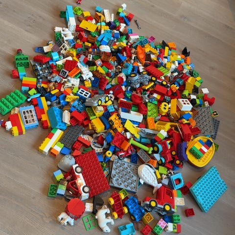Selger et stort Duplo sykehus. Inneholder to leger, to syke pasienter (hvor en er baby), ambulanse med sirener som blinker og lager lyd, liten ambulansebil, to senger ++