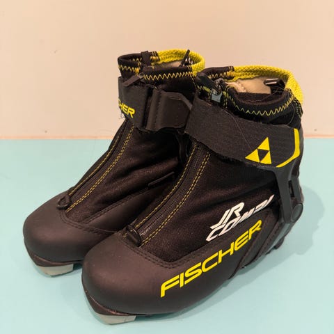 Fischer skisko i størrelse 34. Skoene er svarte med gule detaljer og har glidelås foran. De er laget for bruk med stålski og har solide pigger under sålen for feste.