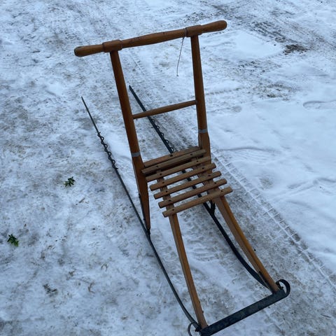 Rapp treslede med trestokker og metallramme. Har håndtak og to vridde metallstenger for styring. Tradisjonell konstruksjon med åpen ramme og tverrstokker for sitteflate. Kan brukes som den er, men er litt rusten. Hentes eller leveres i Oslo.