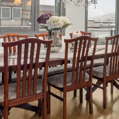 Spisegruppe i god stand med 1 innleggsplate og 8 stoler. Noen av stolene har områder der maling har flasset litt av, ikke vært sjenerende for oss.