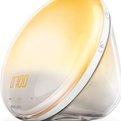 Philips Wake-Up Light i hvit farge. Dette produktet simulerer soloppgang for en naturlig oppvåkning. Den har justerbare lysstyrker og innebygde lyder for å forbedre oppvåkningsopplevelsen (lyd kan være vekkerklokkelyd, lyder fra naturen eller radio (FM?).