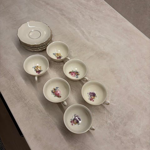 Hutschenreuther Weißenstein Kaffekopper og asjetter i porselen med gullkant