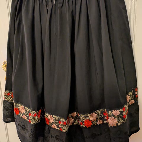 Selvsydd festdrakt i strl S. Blusen er fra co couture i S, men er ikke til festdrakt i utgangspunktet. Kan få med den dersom det er ønsket. Hobbysying, så ingen profesjonell skredder. Veldig fin og unik festdrakt. Konfirmasjon? 17.mai?