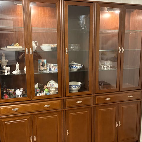 Elegant eikesjenk med vitrineskap og integrert belysning selges.