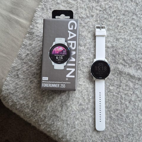 Garmin Forerunner 255 music GPS-klokke med hvit reim. Kjøpt brukt men falt ikke i smaken. En liten ripe i skjermen, vises på bilde og kun i en rett belysning. Har ingen betydning for bruken.