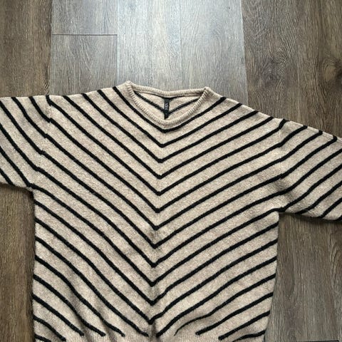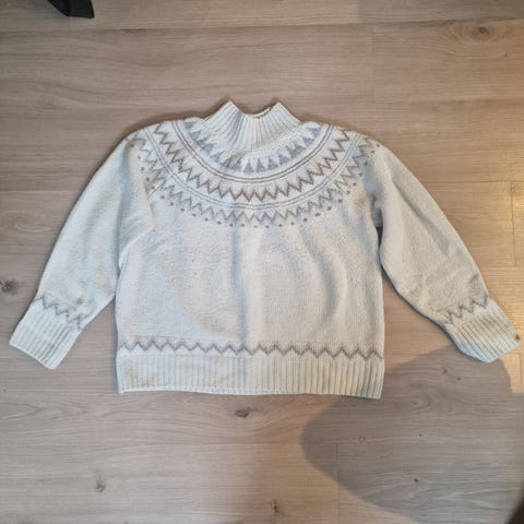 Modellen har rund hals, lange ermer samt ribbekant i ermeåpningene, hals og nederst.