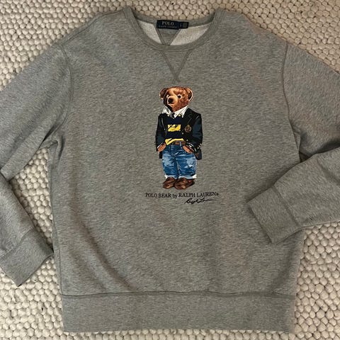 Ralph Lauren Polo Bear T-skjorte i størrelse L. T-skjorten er laget av bomull og har en grå farge. Den har et trykk av Polo Bear på forsiden.