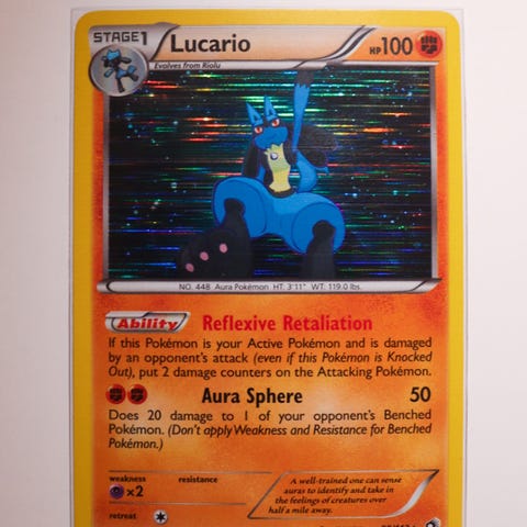 Pokémon Lucario GX samlekort med holografisk effekt. Kortet viser Lucario med angrepet Rising Fist som gjør 140 skade. Kortet har standard størrelse for Pokémon kort.