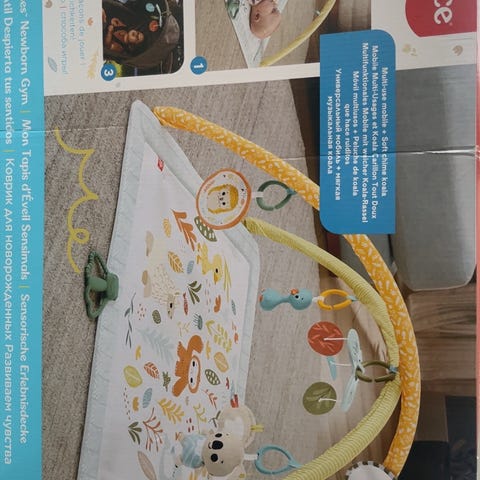 Fisher-Price babygym / aktivitetsleke for barn med fargerikt dyremotiv og lyd, myke leker og rangleleker. Passer for spedbarn og småbarn, designet for sensorisk stimulering og motorisk utvikling.
