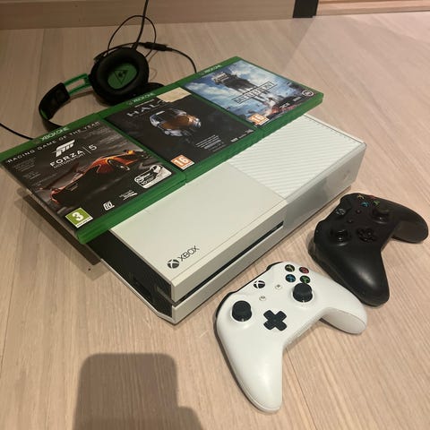 Xbox One Xbox One konsoll i svart farge. Inkluderer kontroller, strømledning og spill. Konsollen har flere porter for tilkobling og støtter HDMI. Ta kontakt hvis det er noe du lurer på eller vil diskutere pris