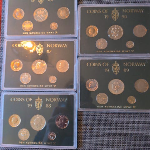 Coins of Norway myntsett fra årene 2014, 2015, 2016, 2017 og 2018. Inneholder flere mynter i original emballasje for hvert år. Myntsettene viser forskjellige norske mynter utgitt i disse årene.