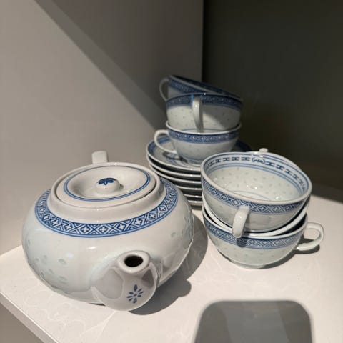 NB: MÅ hentes i Trondheim. Te-kanne. Sukkerskål med lokk. Fløtemugge. 6 te-kopper med tefat og tallerken. Godt brukt!