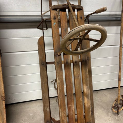 Klassisk treslede med metallramme og ratt. Sleden har tre seter og er utstyrt med et ratt for styring. Materialer inkluderer tre og metall.