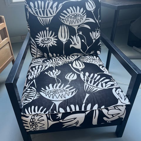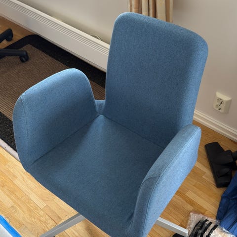 Selger pent brukt stol fra Ikea. Ny pris stol og pute ca 900 kr (695 for stol og 199 for pute). Se bilde for mål. Kan heves og senkes. Må hentes
