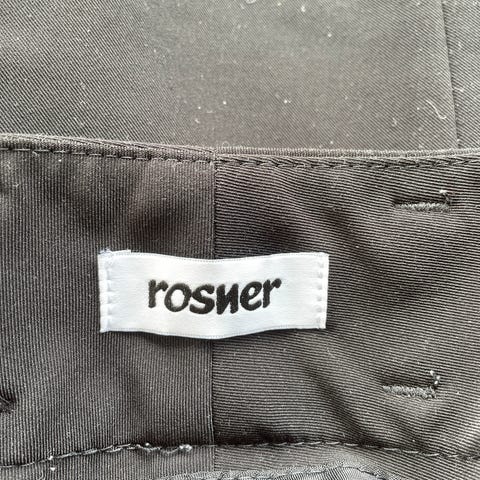 Med press. Stikklommer, lukkes med glidelås. Linning med hemper til belte. Skjulte lommer bak og et diskret Rosner merke.