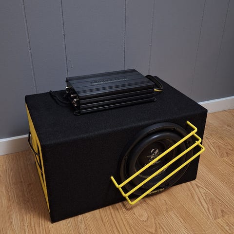 Ground Zero GZHW 10SQ subwoofer med beskyttelsesgitter og forsterker.Subwooferen er montert i en lukket kasse med svart og gul farge. Egnet for billydanlegg.
