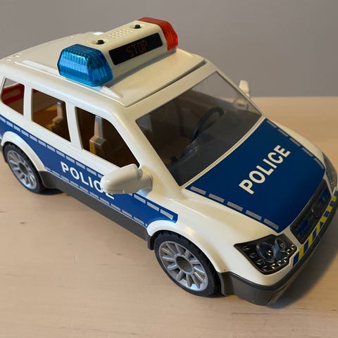 Playmobil politibil 6920 med blått lys på taket, to politifigurer og tilbehør inkludert koffert, verktøy, og diverse små gjenstander.