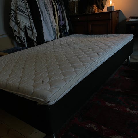 Selger denne rammemadrassen, med overmadrass, som har litt brukt på gjesterom.