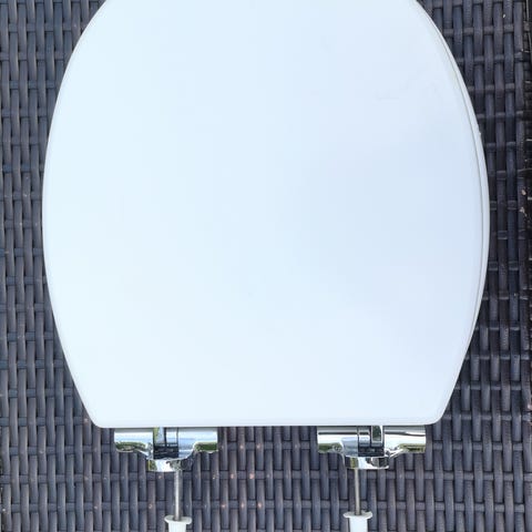 Toalett i hvit keramisk med toalettsete. Passer for baderom. Standard størrelse og design.