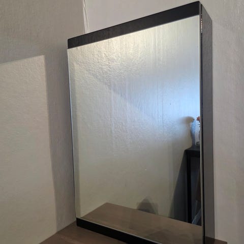 Speilskap med fire dører og integrert belysning. Produktet er hvitt/lyst grått og egnet for oppbevaring på bad eller lignende rom.