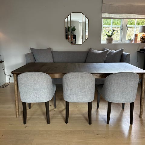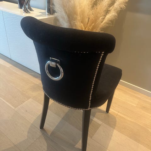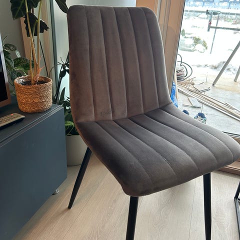 Med tungt hjertet selger vi disse nydelige spisestolene fra Møbelringen. Selges på grunn av at de ikke passer vårt nye spisebord. De er utrolig gode å sitte i, og har fortsatt masse brukstid igjen. De er pent brukt, og har et stoff av velur som er av god kvalitet. Til tross for matsøl, er det veldig enkelt å vaske det bort. Omtrent alle flekker går veldig enkelt bort med en våt klut.