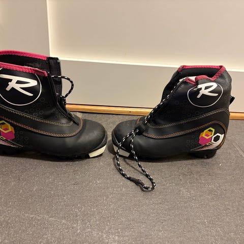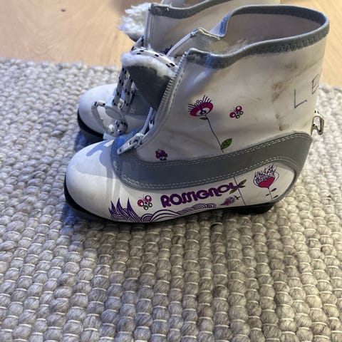 Rossignol P-3 barn langrennsstøvler i størrelse 31. Støvlene er svarte med turkise detaljer og har snøring med låsemekanisme. Innvendig er de foret med mykt materiale for komfort og varme. Sålen har godt grep tilpasset langrenn.