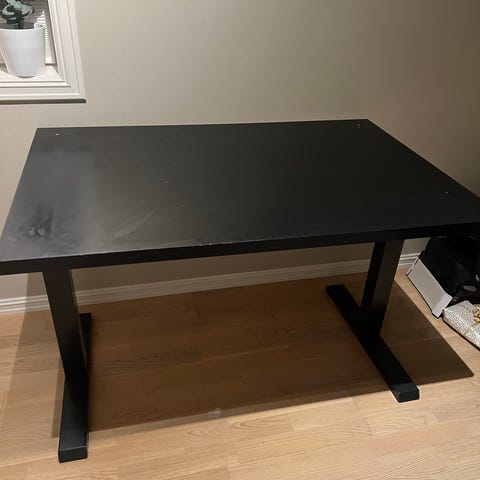 Kjøpt brukt, vet ikke fra hvor og det er ingen merkelapper. Pent brukt, ingen slitasje, men en flekk som sikkert går av i vask, og en liten rift (se bilder). Sorte trebein.