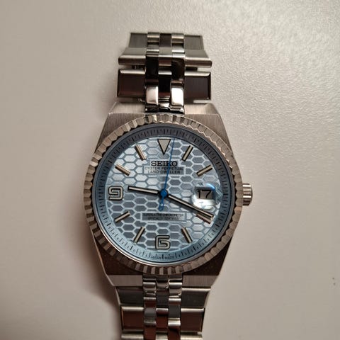 Selger en meget pen Seiko Santos-style mod i 38 mm. Klokken er så vidt brukt og fremstår som ny. Manuelt sammensatt med originalt Seiko-urverk, safirglass og solid 904L rustfritt stål i både kasse og lenke. Klassisk og tidløst design som passer både til hverdag og pent.