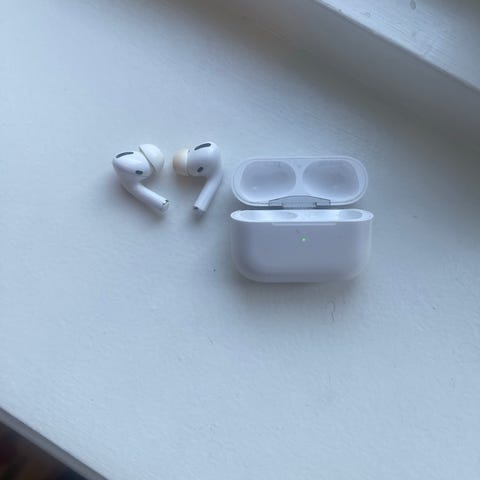 Apple AirPods Pro trådløse hodetelefoner i hvit farge. Leveres med ladeetui og ekstra ørepropper i ulike størrelser. Designet for trådløs bruk med aktiv støydemping.