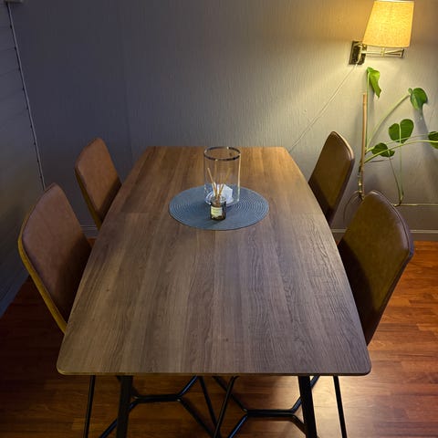 Ingen merker. Naturlig bambus gjør dette bordet lett og allsidig, men det slitesterke materialet er også varmt og innbydende. Kjøpt i høst 2025. Må hentes